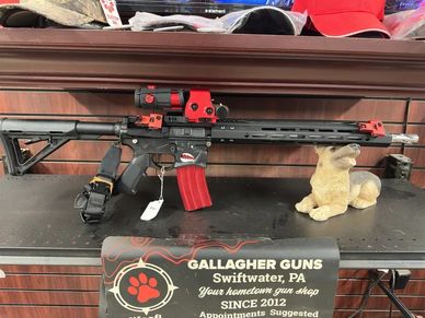 Equipped with trijicon scope and Knight Armament quad rail. Also comes with a soft case